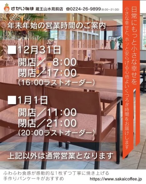 さて、さかい珈琲では、朝の8時から夜の9時までの営業時間で年中無休にて皆様のご来店をお待ちしておりますが、年末年始については、営業時間が変更になりますのでご注意下さい。
